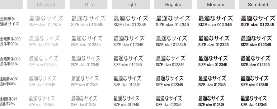 「金剛黒体コンデンス」は、金剛黒体を様々な用途に合わせて使用できるように、基準となる金剛黒体から90%、85%、80%、75%の4種類の長体率と6種類のウエイトで展開するコンデンス書体です。